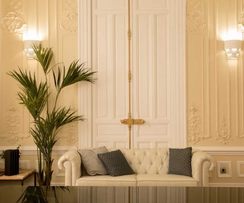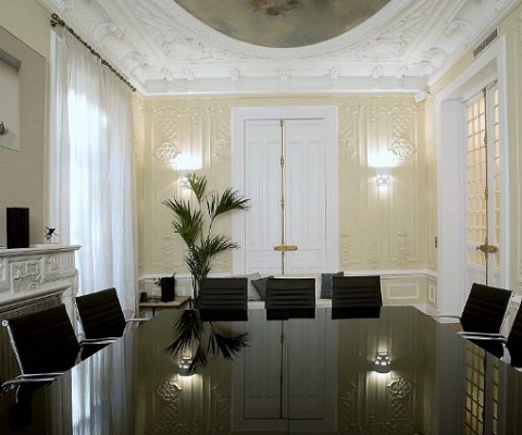 The building of the business center in Madrid GSG Business Hub Serrano dates from 1895 and has numerous architectural and ornamental elements protected by National Heritage. It retains most of its original characteristics, which make it a space where the distinction and elegance that only the passage of time and respect for tradition can confer are “felt”. The height of the ceilings, the chimneys, the moldings, the vintage latches and hinges, the marbles and the parquet floors create a palatial and exclusive environment.