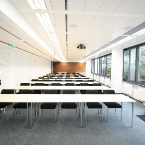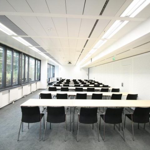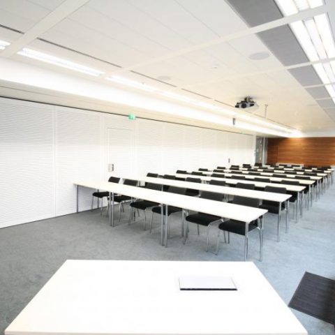 Mögliche Raumbelegungen: Kino (100 PAX), Klasse (48 PAX), Block (32 PAX), U (32 PAX), O (36 PAX), Sesselkreis (50 PAX)