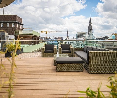Die exklusiven und vollausgestatteten Räume im COLLECTION Business Center Hamburg City Hohe Bleichen befinden sich im 6. und 7. Obergeschoss eines einzigartigen Gebäudes. Die bodentiefen Fenster sorgen für ausgezeichnete Lichtverhältnisse und die elegante Innenarchitektur vermittelt eine wahre Wohlfühlatmosphäre. Darüber hinaus lädt die Dachterrasse zum Entspannen in den Pausen ein. Die preiswerten Tagungsräume dieser Location können Sie ganz flexibel buchen – effizient und kostengünstig.
