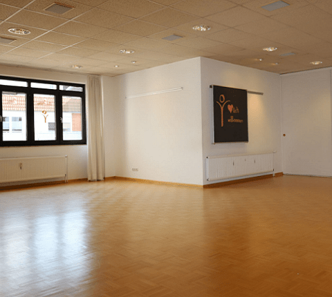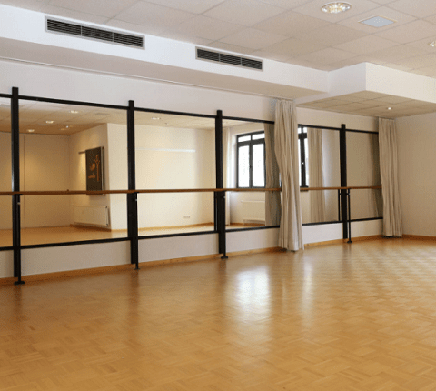 Raum 2 kann auch für Sportkurse, Yogastunden, Ballett- oder Tanzkurse genutzt werden. Der Raum hat eine große Spiegelwand (die mit Vorhängen verdeckt werden kann) mit Ballettstange.